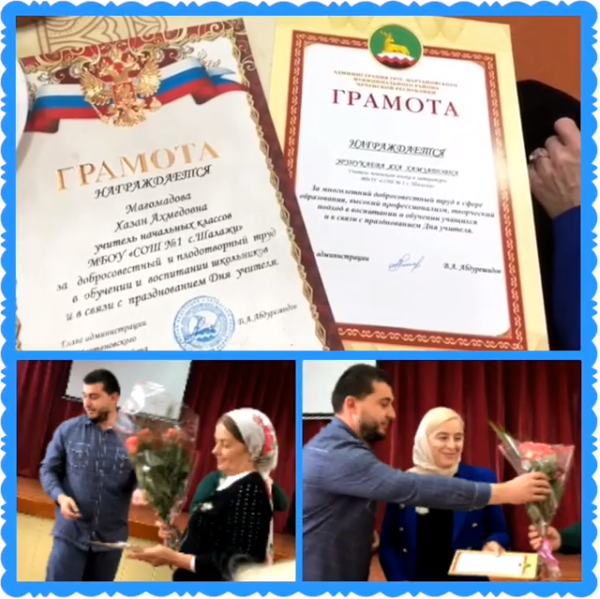 06.10.2018Торжественное награждение учителей, приуроченное к Международному дню учителя. Почетными грамотами администрации Урус-Мартановского муниципального района были награждены учитель начальных классов Магомадова Х.А. и учитель чеченского языка и литературы Эрзнукаева Я.Х. Дала т1аьхье беркате йойла!